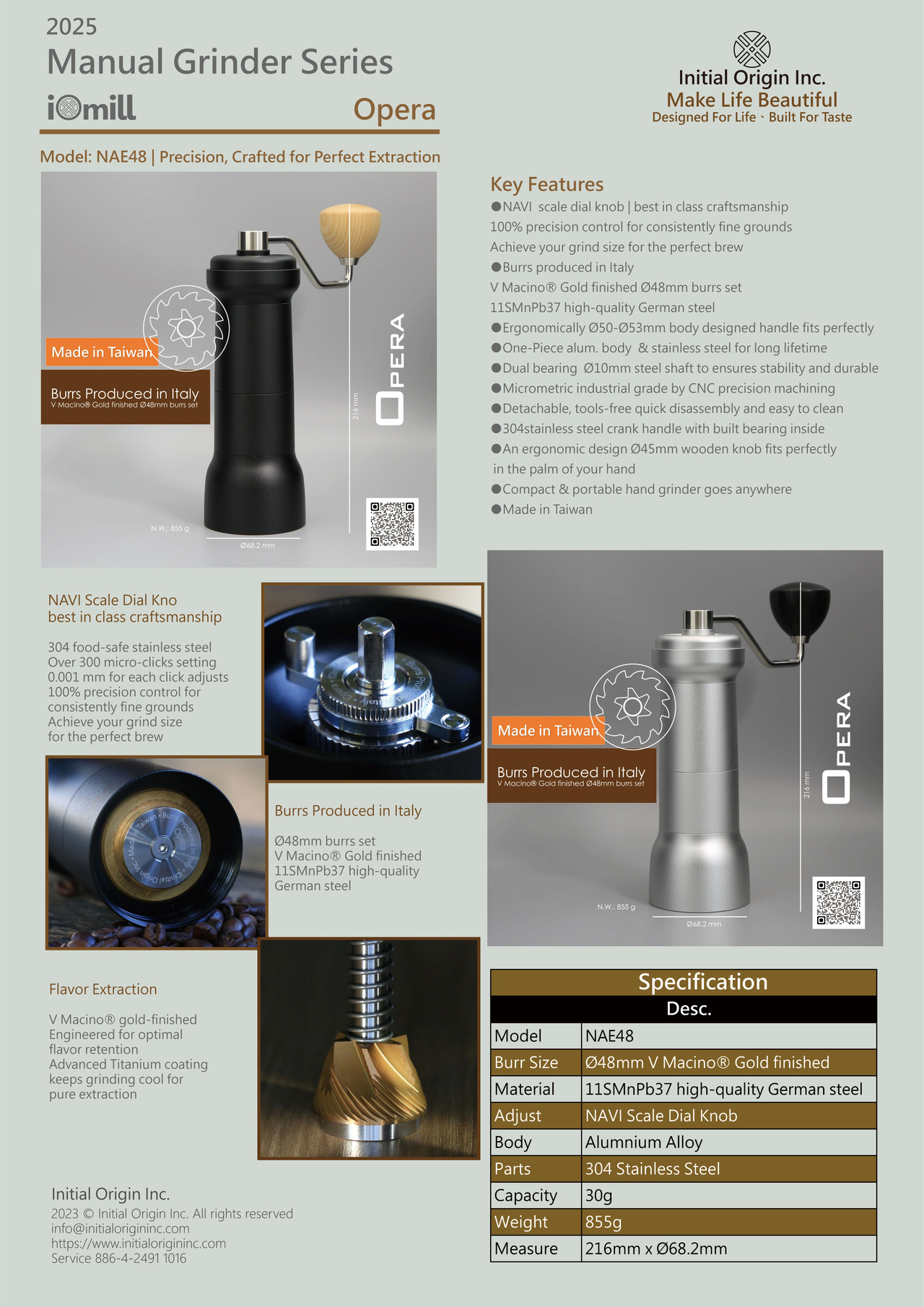 ●NAVI scale dial knob | best in class craftsmanship 100% precision control for consistently fine grounds Achieve your grind size for the perfect brew ●Burrs produced in Italy V Macino® Gold finished Ø48mm burrs set 11SMnPb37 high-quality German steel ●Ergonomically Ø50-Ø53mm body designed handle fits perfectly ●One-Piece alum. body & stainless steel for long lifetime ●Dual bearing Ø10mm steel shaft to ensures stability and durable ●Micrometric industrial grade by CNC precision machining ●Detachable, tools-free quick disassembly and easy to clean ●304stainless steel crank handle with built bearing inside ●An ergonomic design Ø45mm wooden knob fits perfectly in the palm of your hand ●Compact & portable hand grinder goes anywhere ●Made in Taiwan